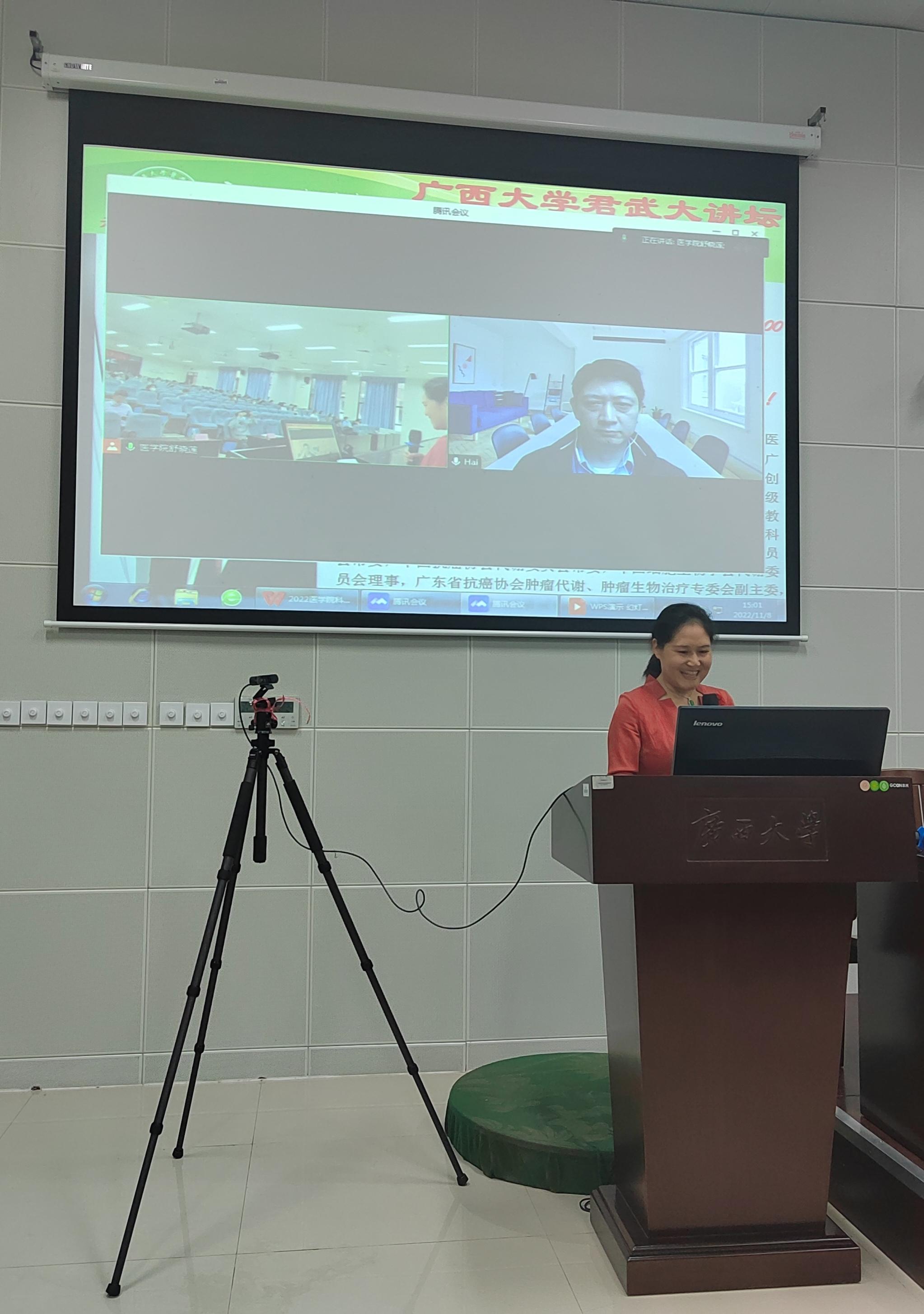 为了加强师生们的交流与合作, 2022年11月8日,304永利集团官网入口君武大讲坛之永利集团官网科技活动月暨生物医药论坛(第一讲)在六教二阶召开。应邀请,中山大学孙逸仙纪念医院胡海教授线上为学院师生做了题为“乳腺癌代谢与转化研究”的学术报告。学院学术院长罗素兰、常务副院长王立升以及学院专任教师和博士、硕士研究生130余人参加了此次报告会。